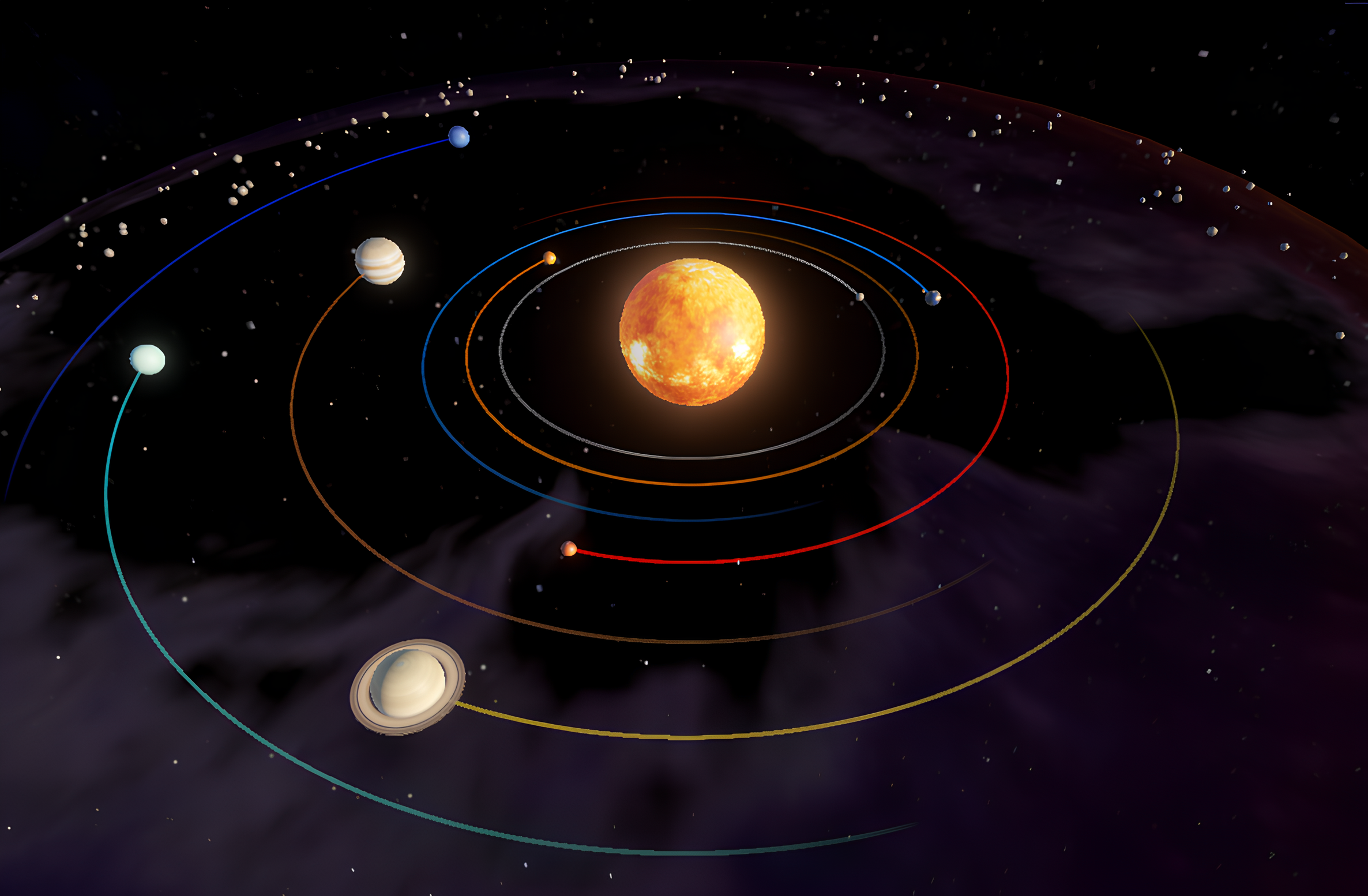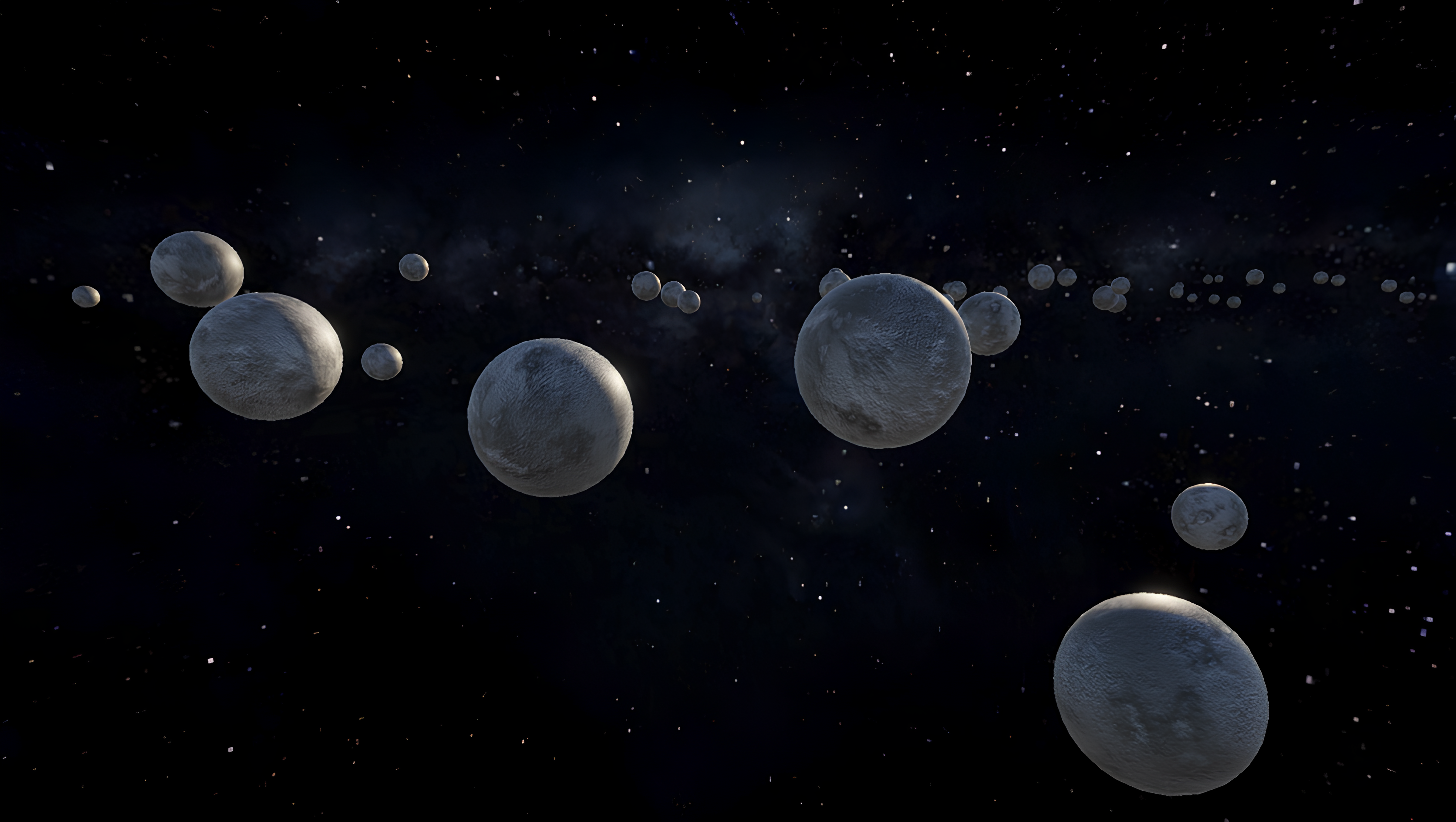 - Additional astronomical objects such as stars, nebula and asteroid belts are also included