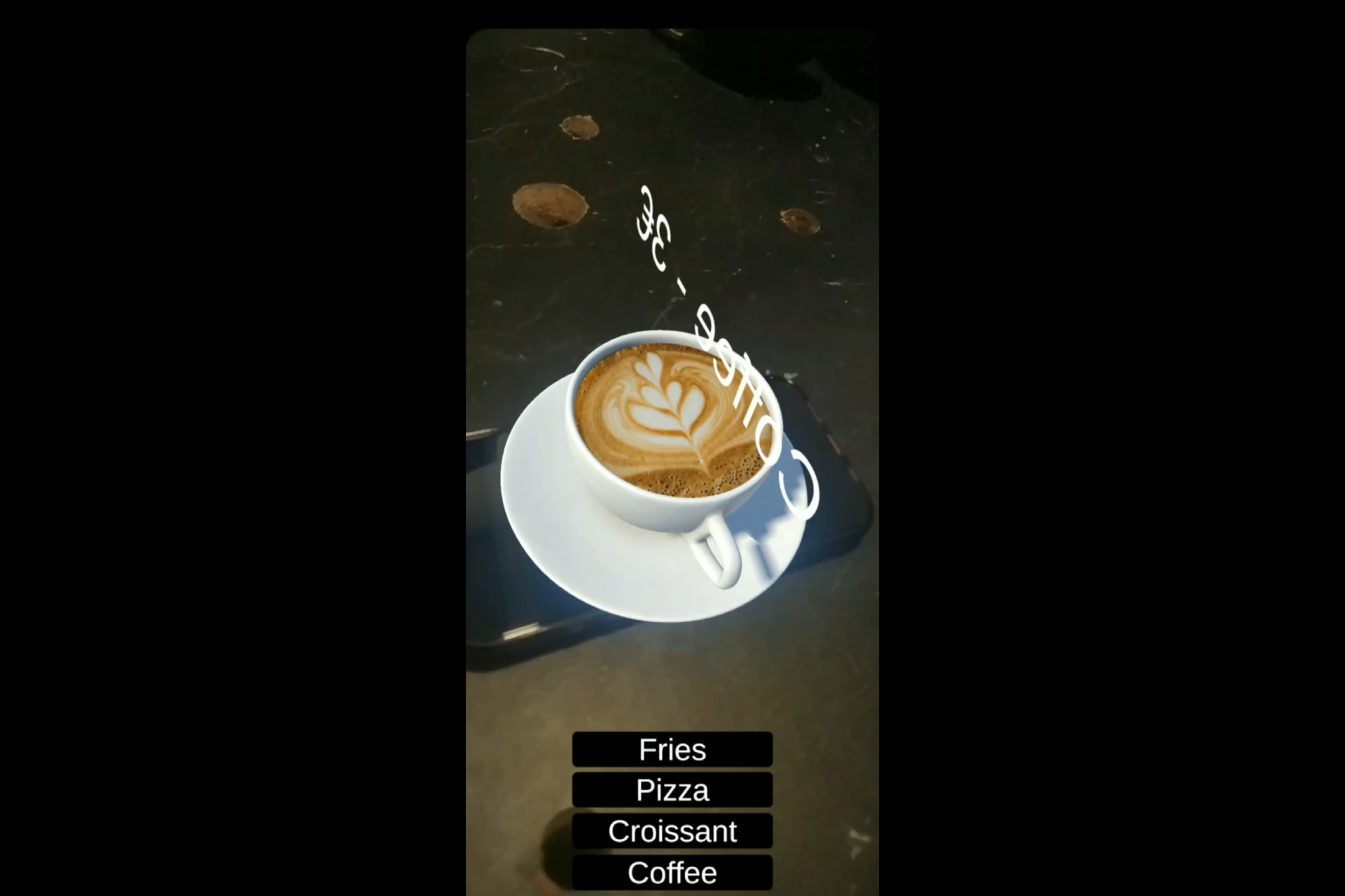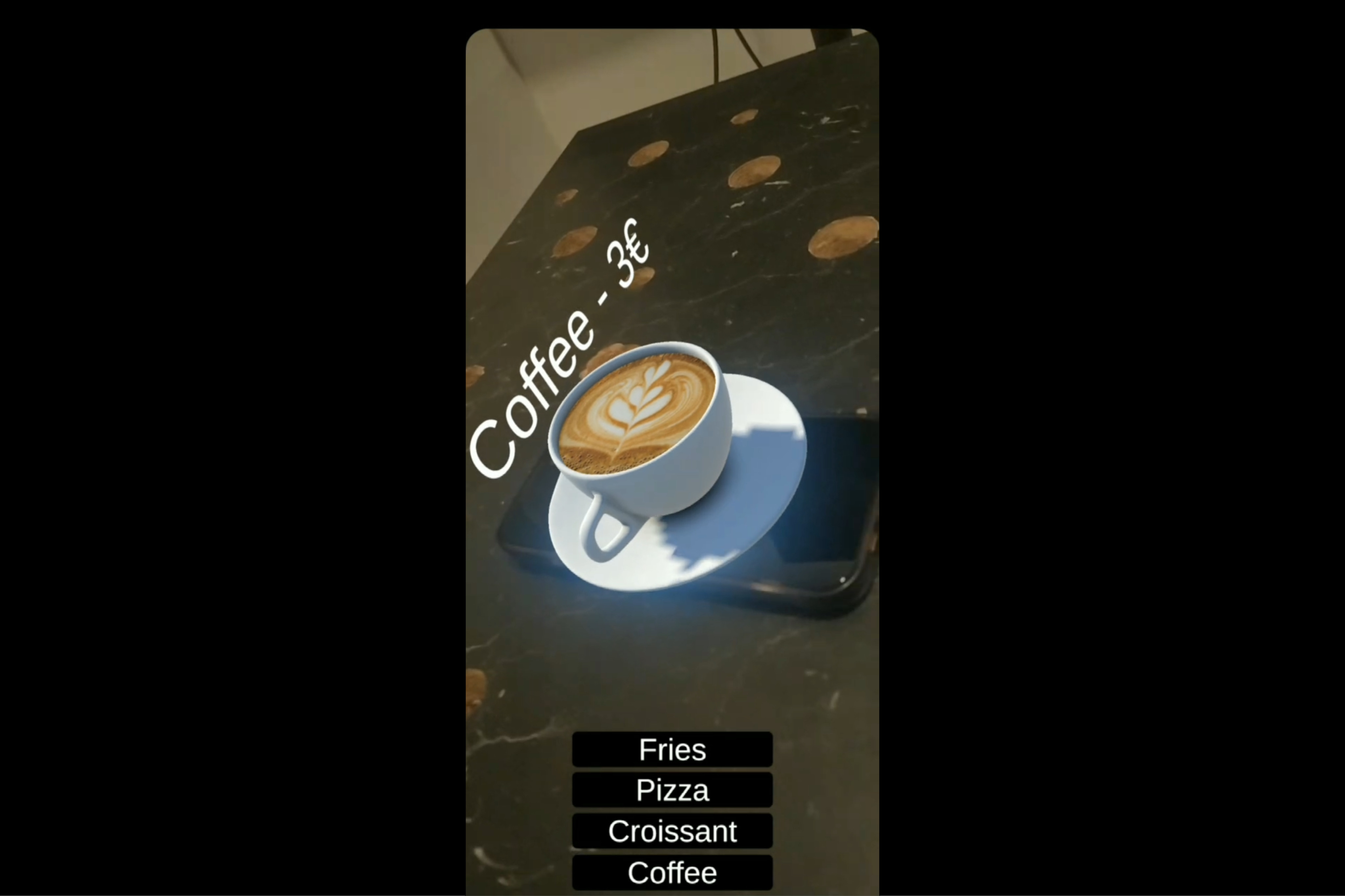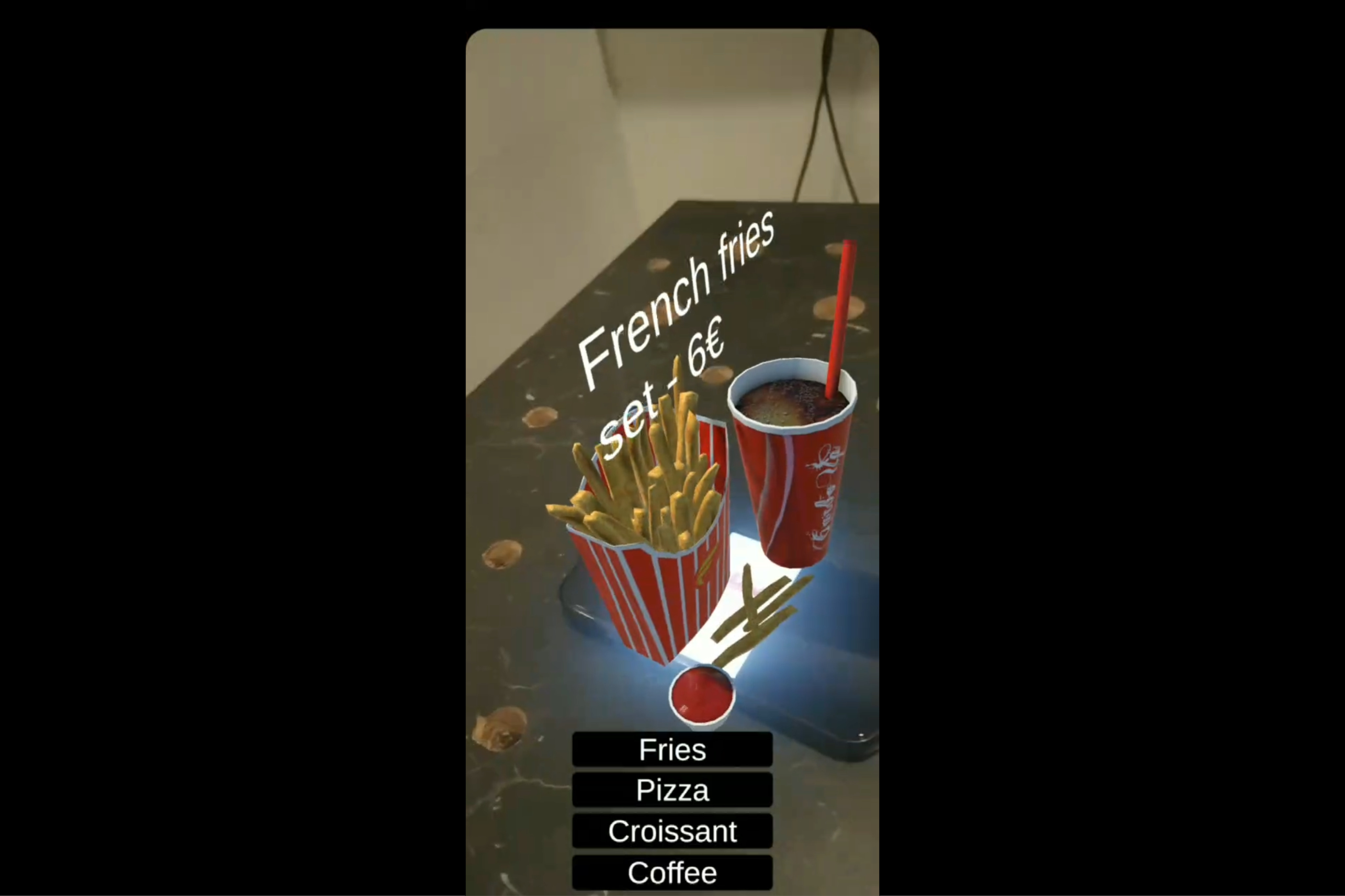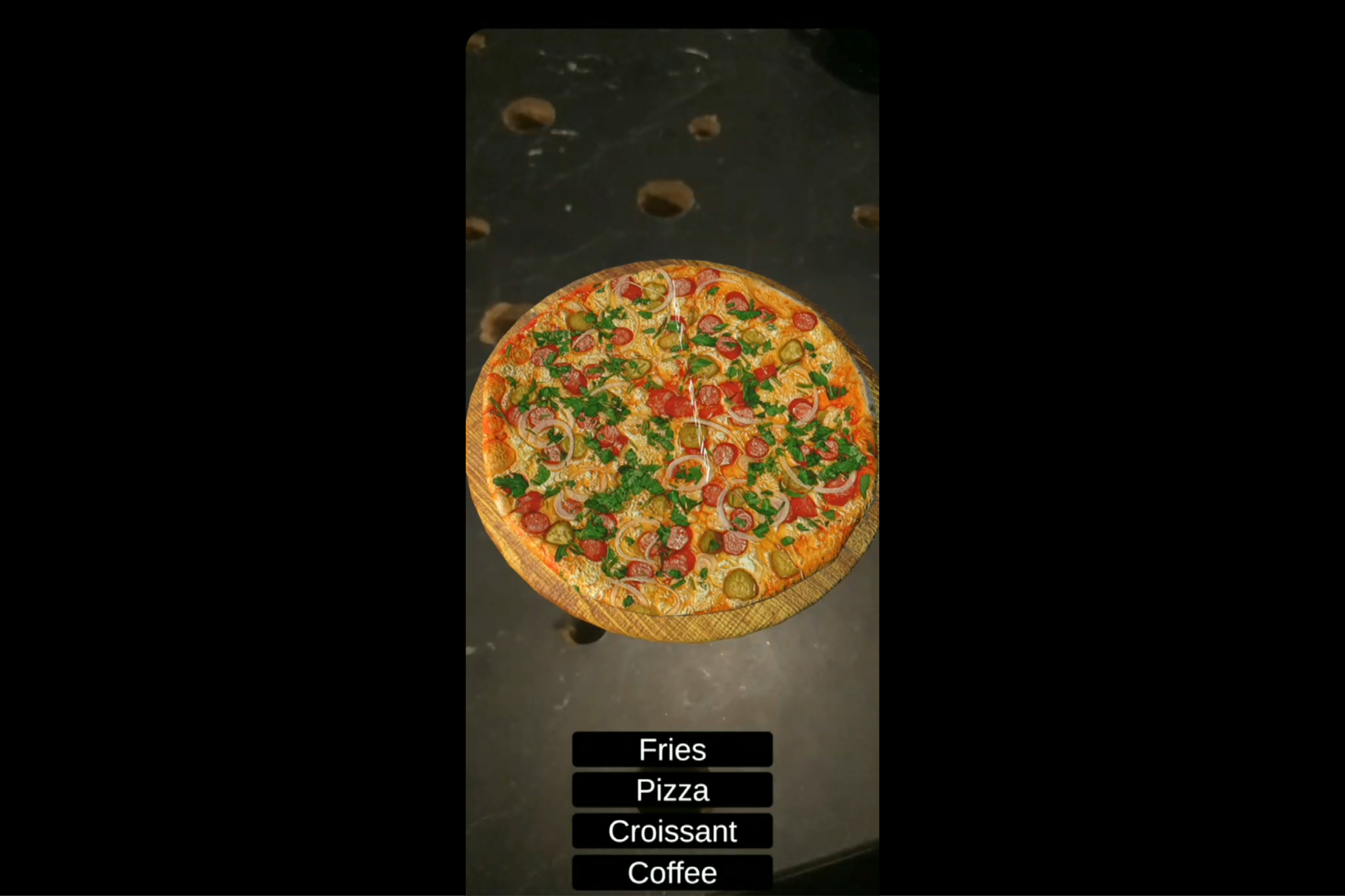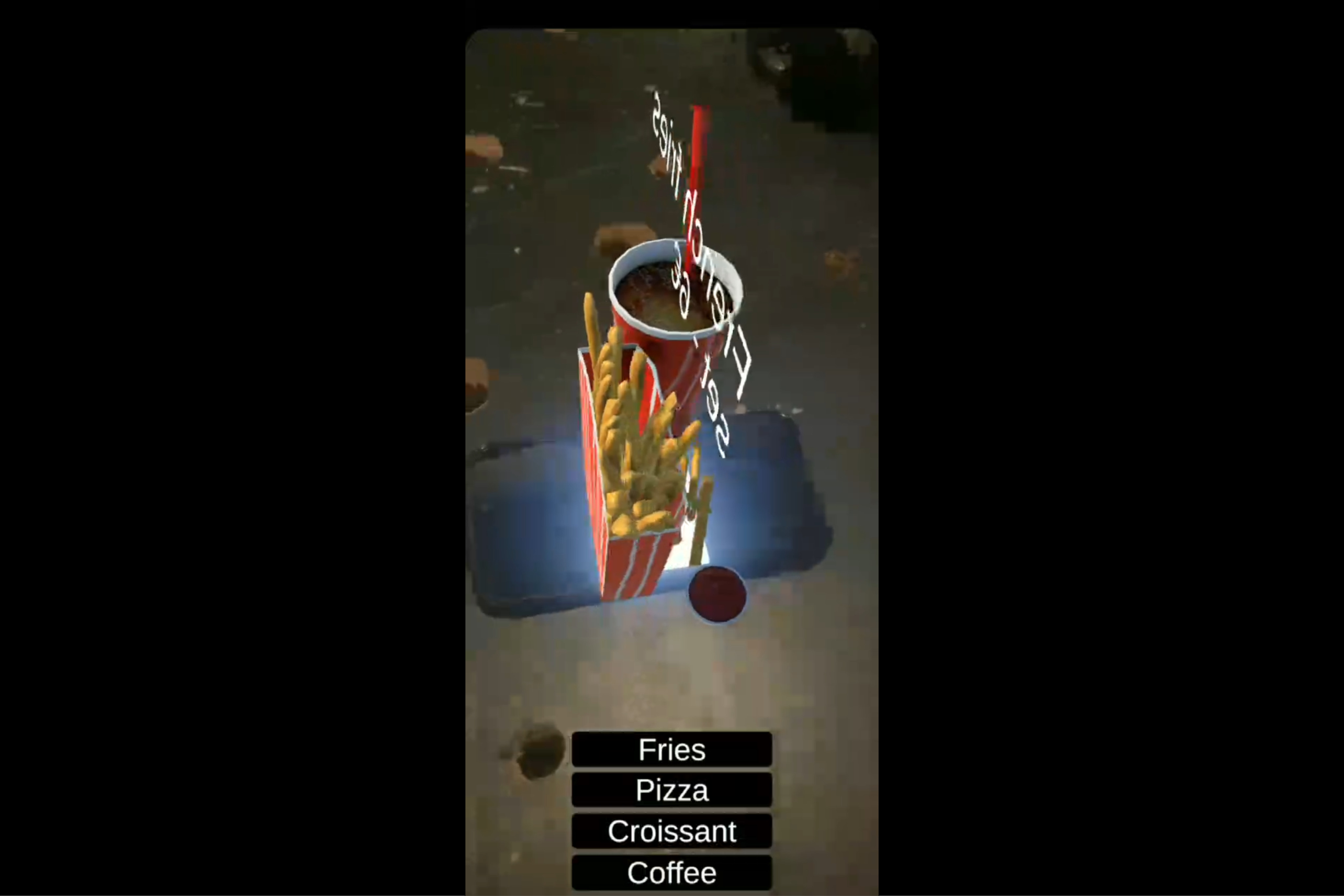 - Interactive UI: A custom screen-space interface that allows users to toggle between different menu items (Pizza, Coffee, Fries, etc.) and place them in the real world.