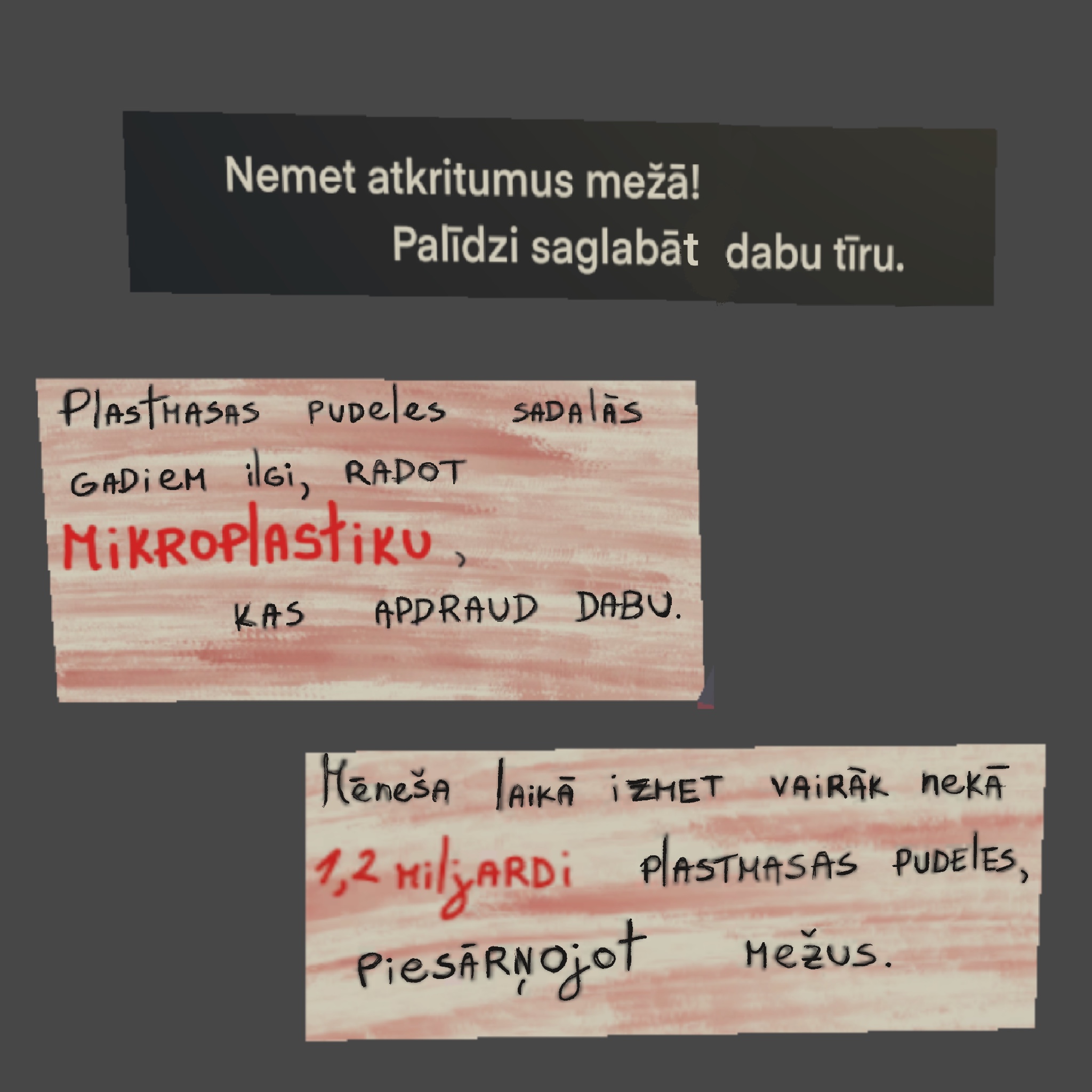 "Mežs nav miskaste" ir papildinātās realitātes projekts, kas pievērš uzmanību plastmasas pudeļu piesārņojumam dabā. Izmantojot AR, piesārņots meža attēls pārvēršas par tīru vidi, kā arī AR vidē tiek novietota plastmasas pudele ar izglītojošiem tekstiem par piesārņojuma ietekmi.