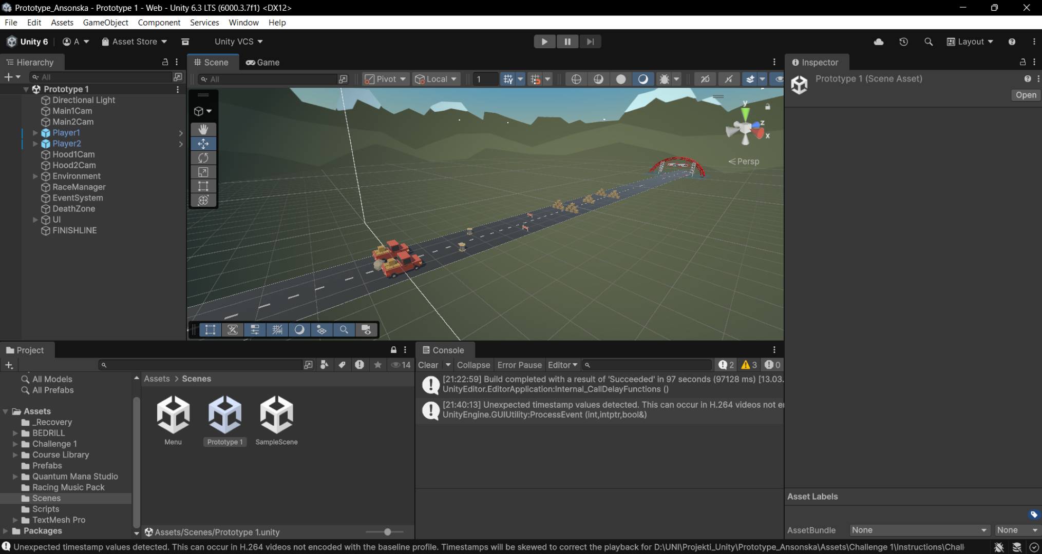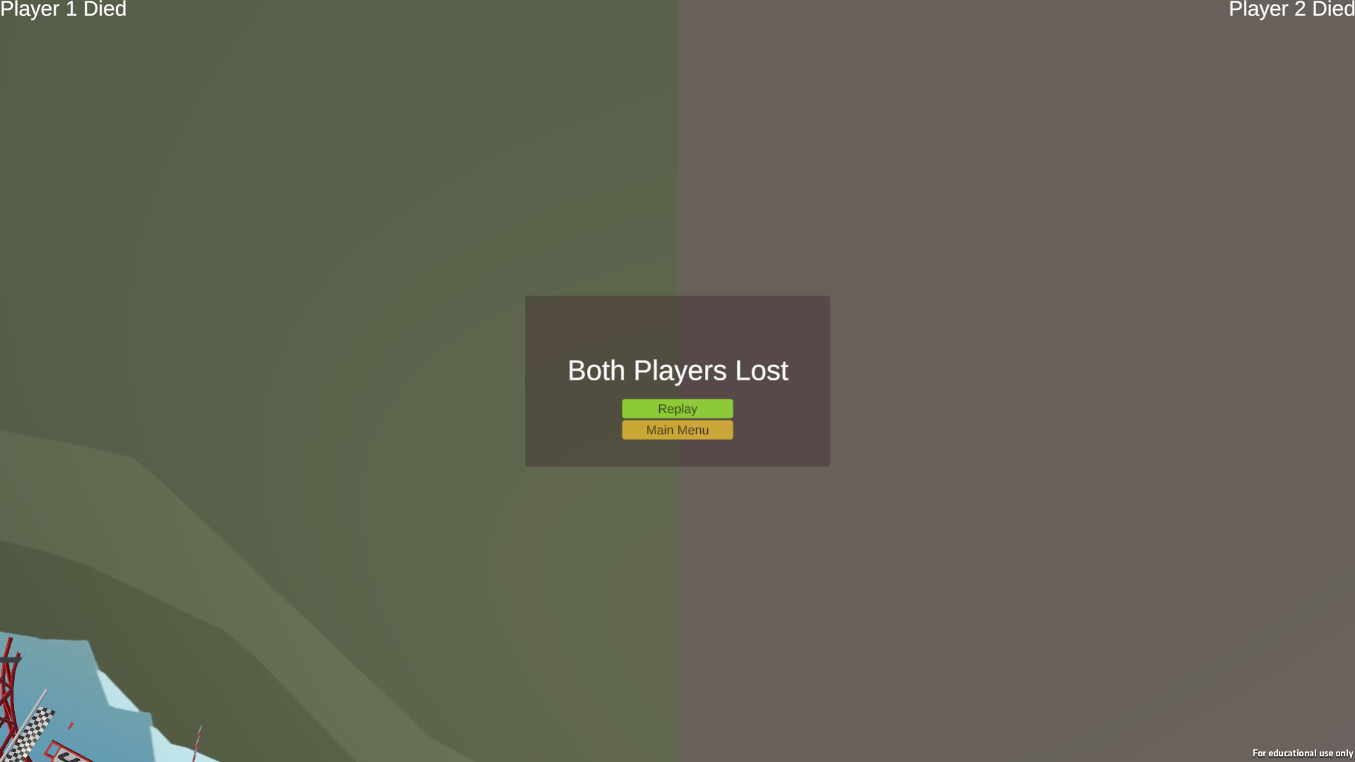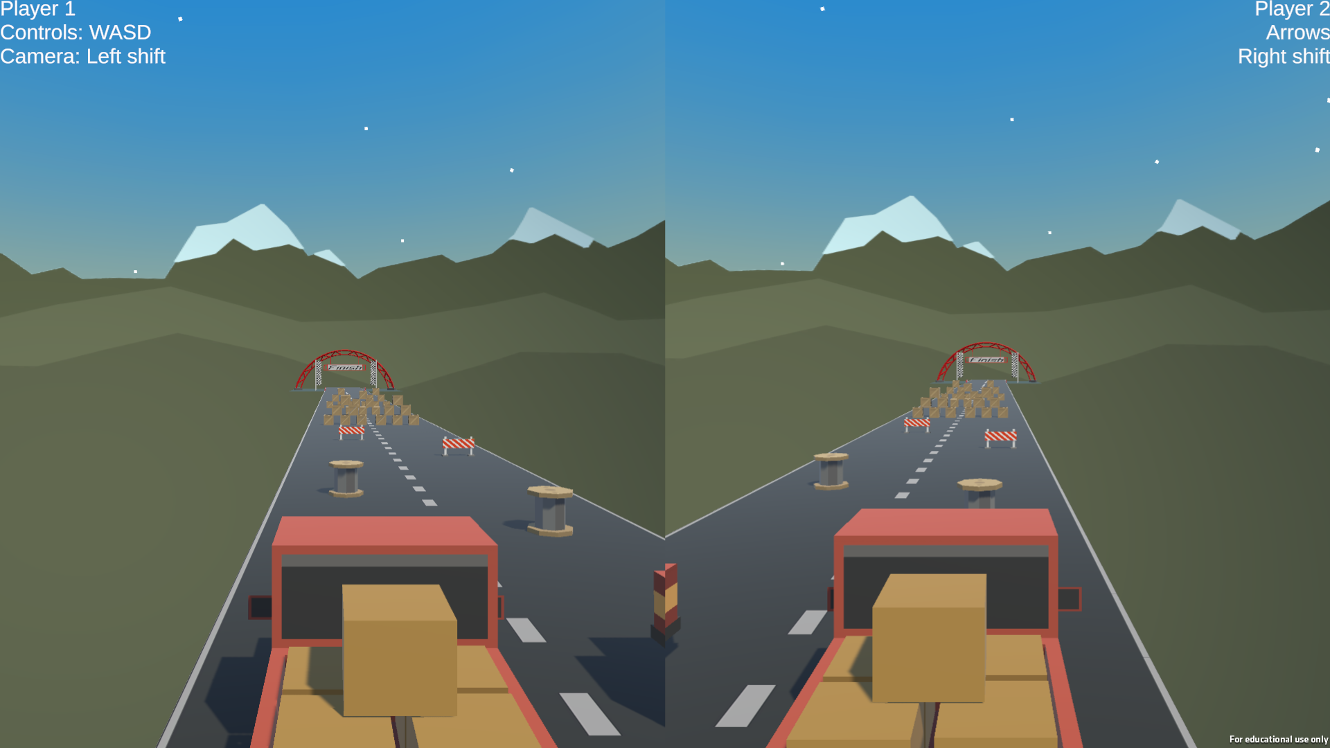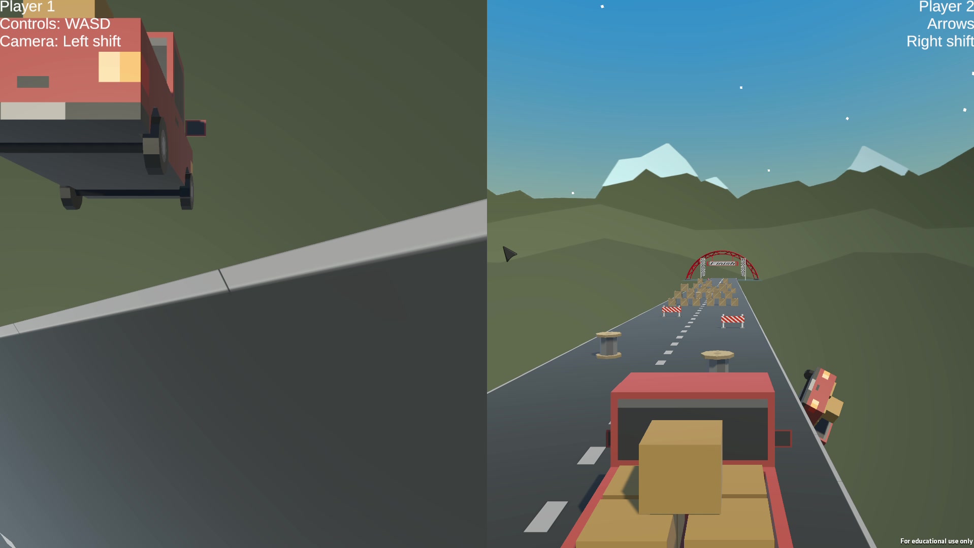Car Racing game controls: Player1: WASD Left Shift to switch cameras Player2: Arrow Keys Right shift to switch cameras Plane Challenge controls: WS / Up and Down arrow keys