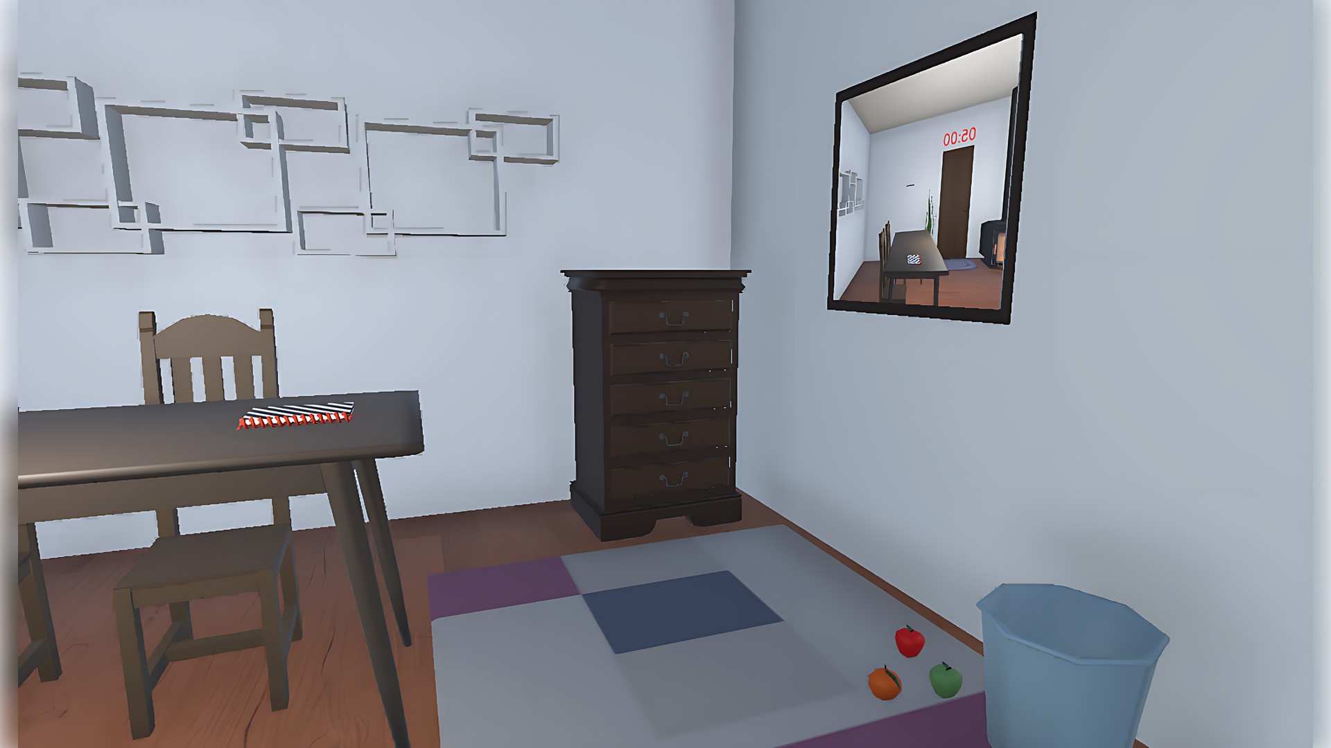 The core focus of the game is speed. You have very little time to escape the room. In the rush and chaos, you must put everything back in its proper place while fast-paced music drives the pressure higher. Every second counts — hesitate, make a mistake, or slow down, and you will fail. Stay sharp, move fast, and keep control, or the room will trap you. As part of this project, I developed a VR game in Unity for the Oculus Quest platform. I implemented an interactive game environment using the XR Interaction Toolkit, configured the XR Rig, hand controllers, and ray-based interaction system for object interaction. I added a world-space user interface with a settings menu, implemented player teleportation and rotation, and used snap turn and teleport locomotion to ensure comfortable movement in virtual space.