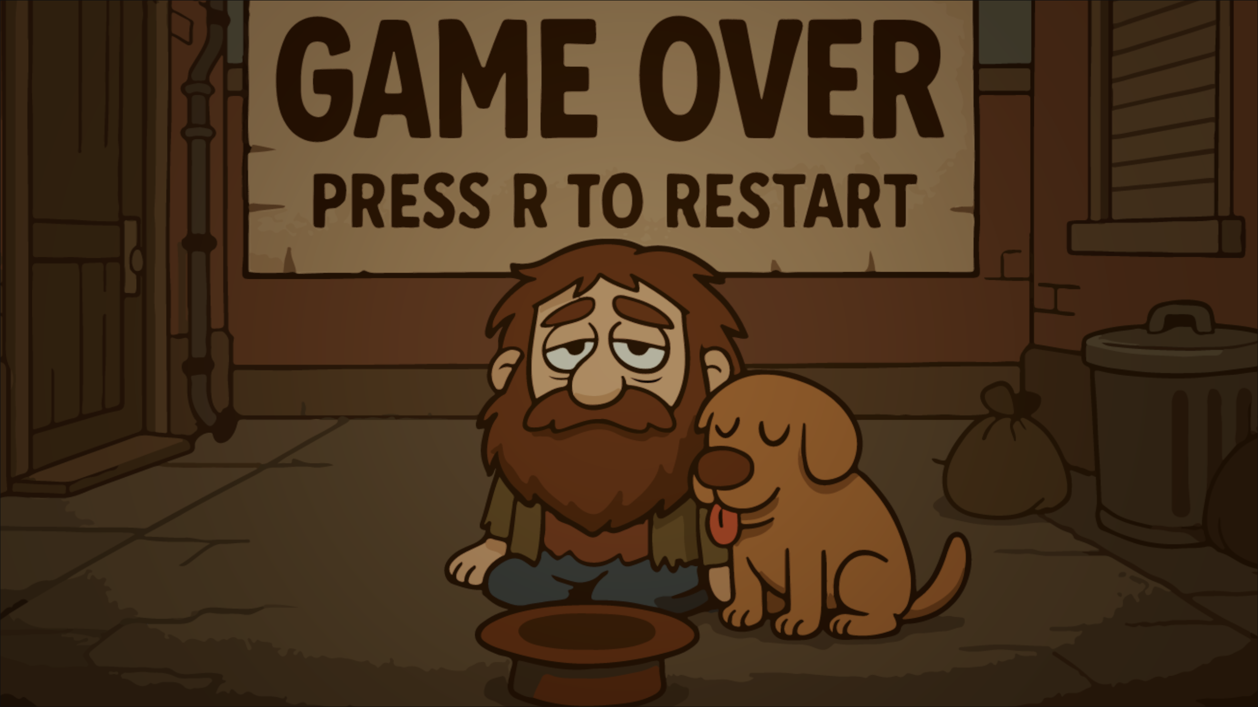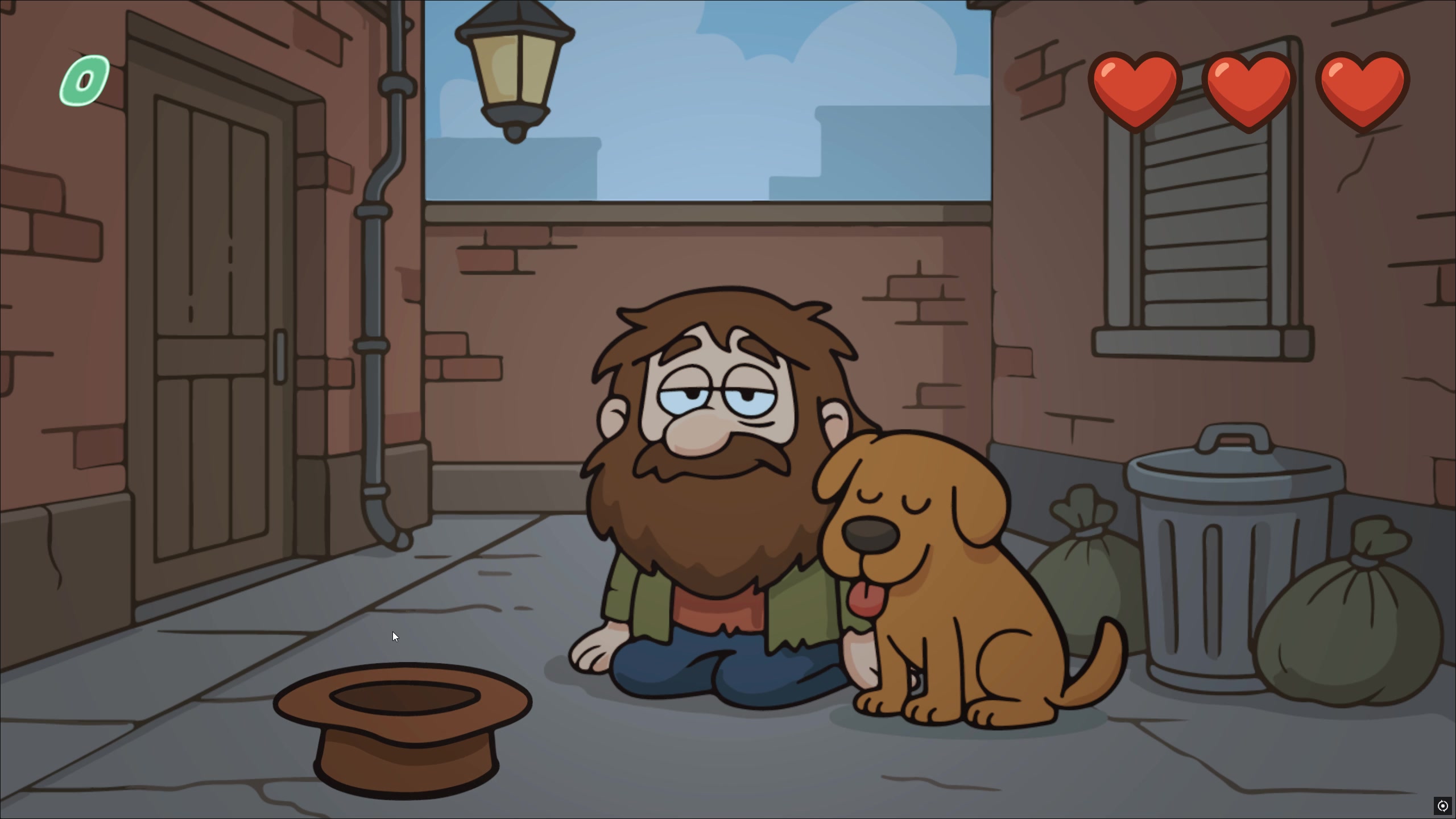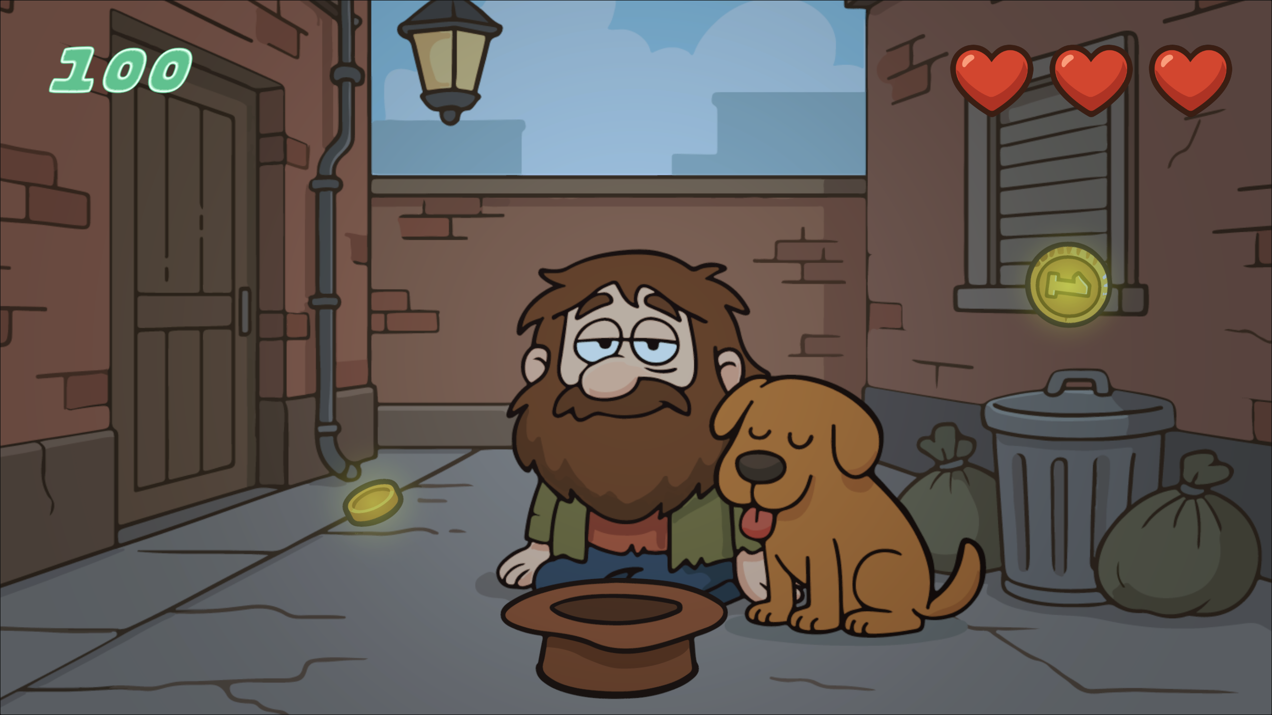 Catch coins with a beggar’s hat in a tiny alley. Move the hat, avoid trash, don’t miss coins or you lose lives. Reach 750 to win. Clear start/victory/defeat screens, simple SFX, URP with 2D lights, WebGL build. A compact, readable prototype.