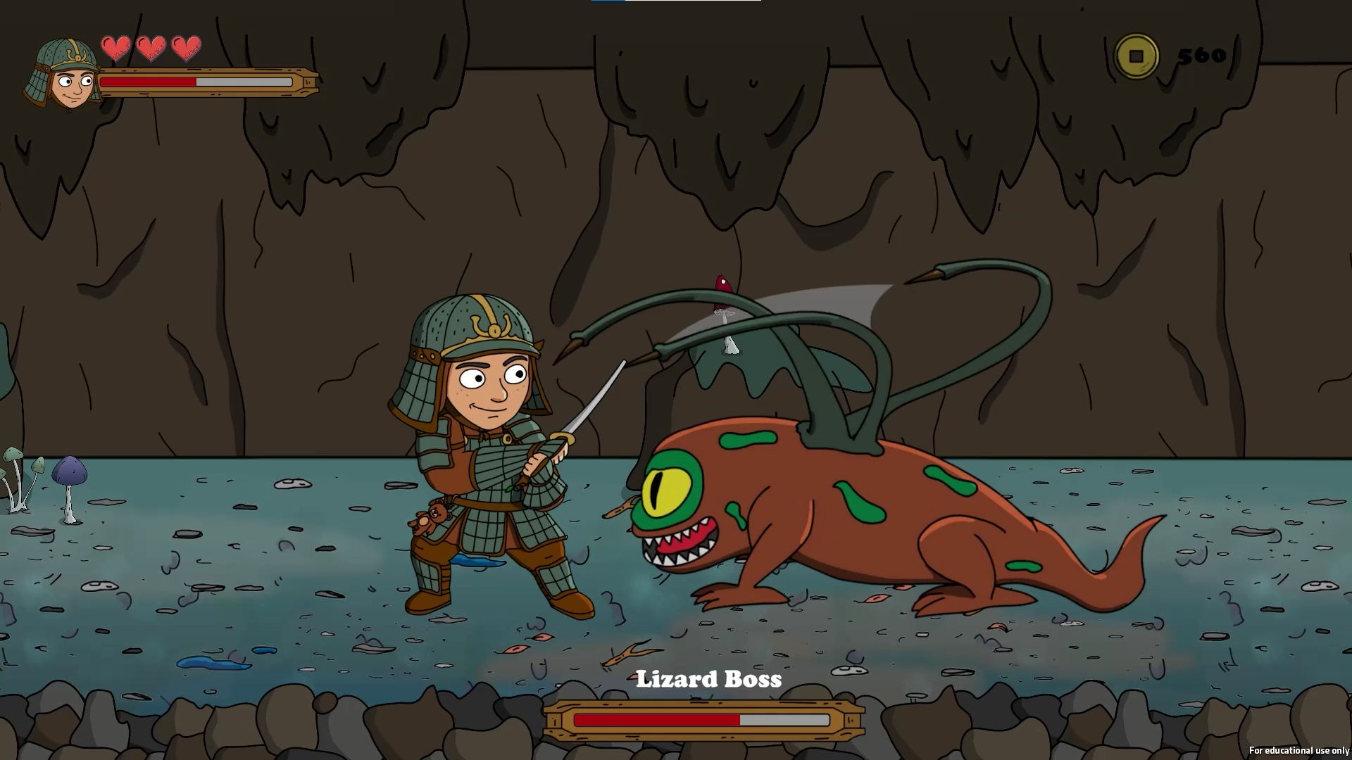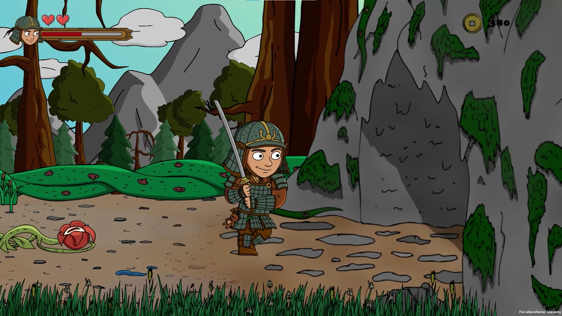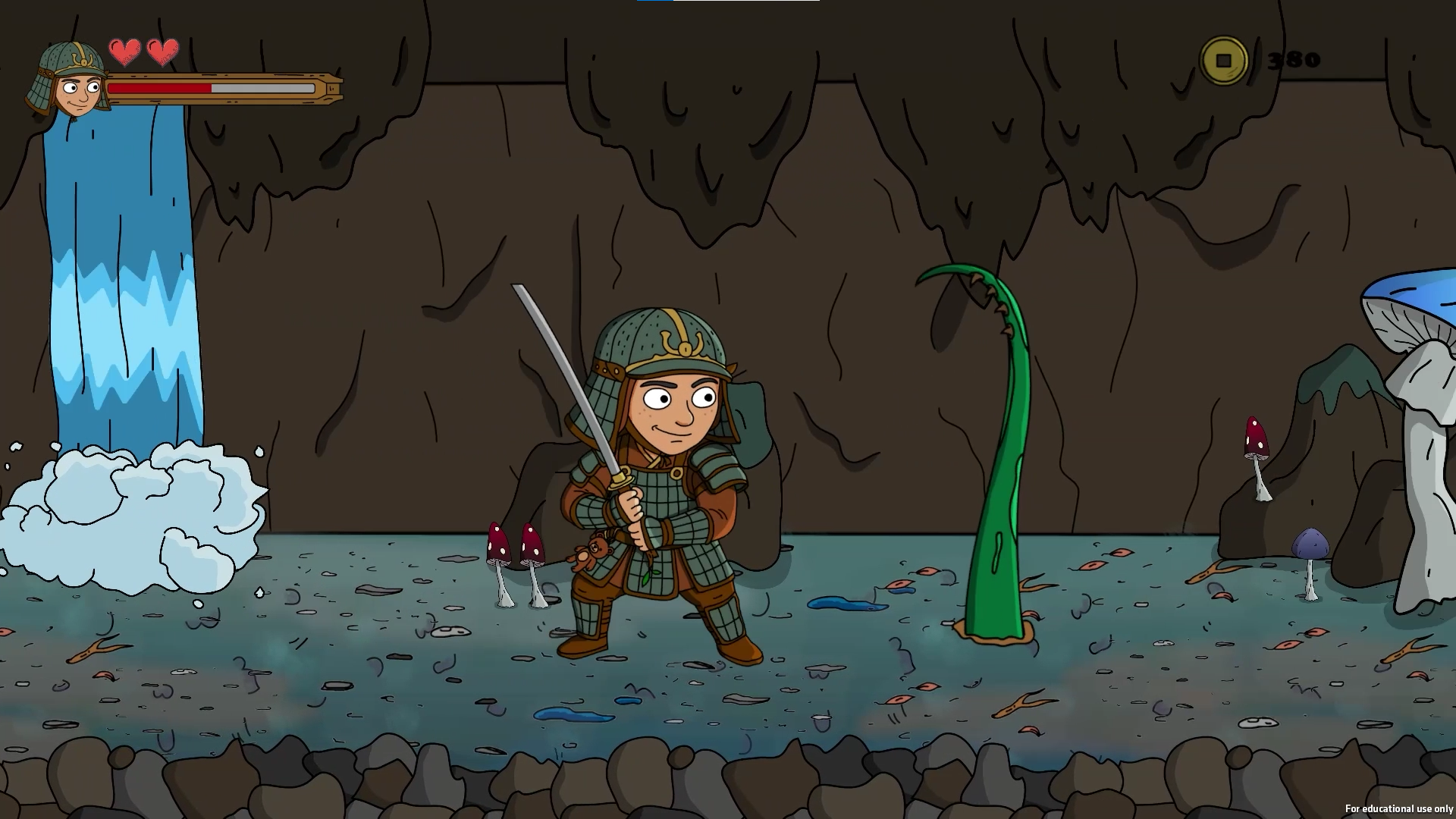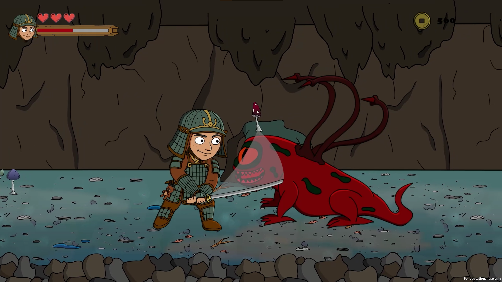 The core gameplay centers on precision sword strikes, timed combo execution, defensive blocking, and short burst movement techniques such as forward slide and backstep for positioning control. Defeated enemies drop coins based on the damage taken, supporting a skill-based reward economy used to unlock armory upgrade. A healing Sakura serves as a limited recovery point. Progressing into a glowing mushroom lit cave marks the transition to the second stage, culminating in a climactic boss fight against the nightmare plant’s avatar. Upon victory, the dream collapses, the child awakens, and the journey ends with a message of resilience and triumph over fear.