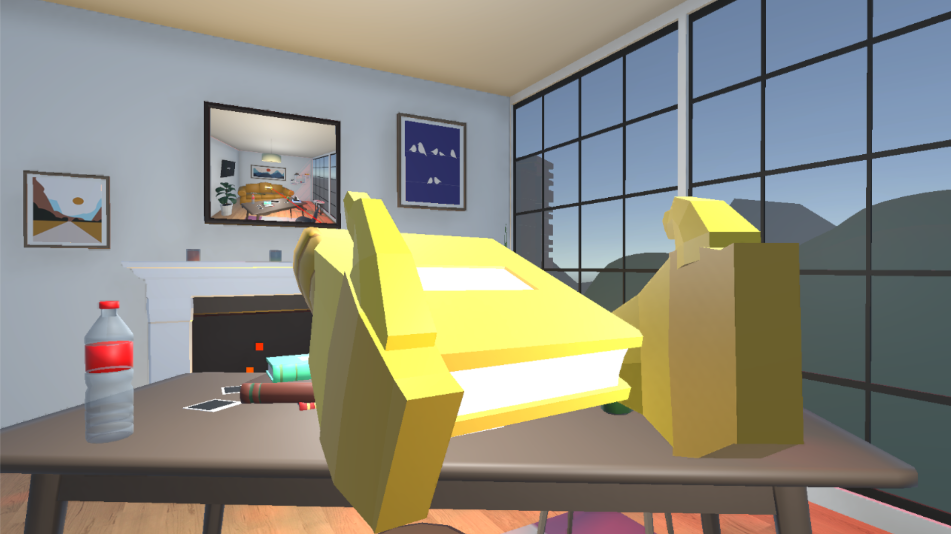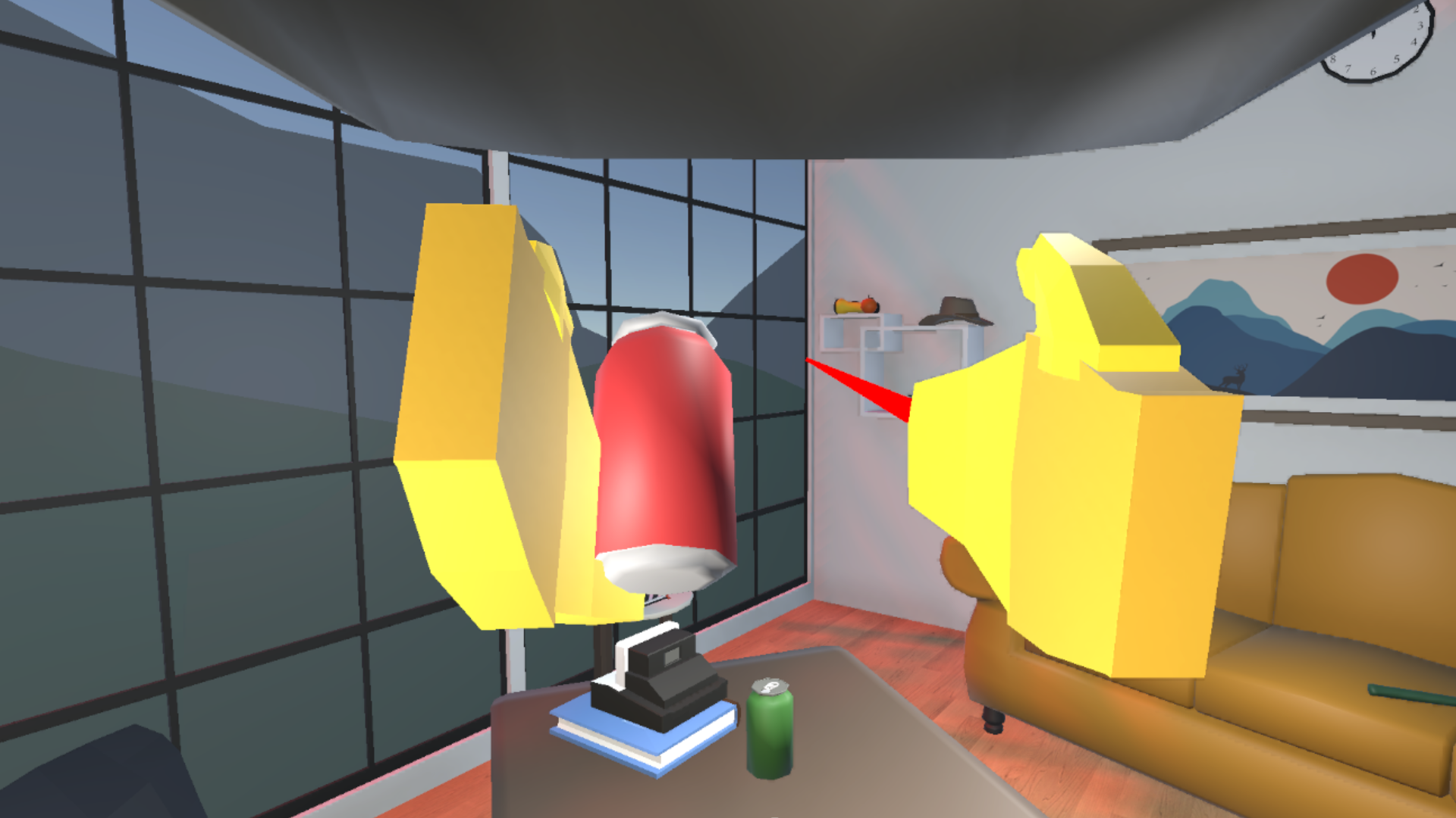You can interact with a red tin can, a yellow book, hats, a tennis ball, and an apple.