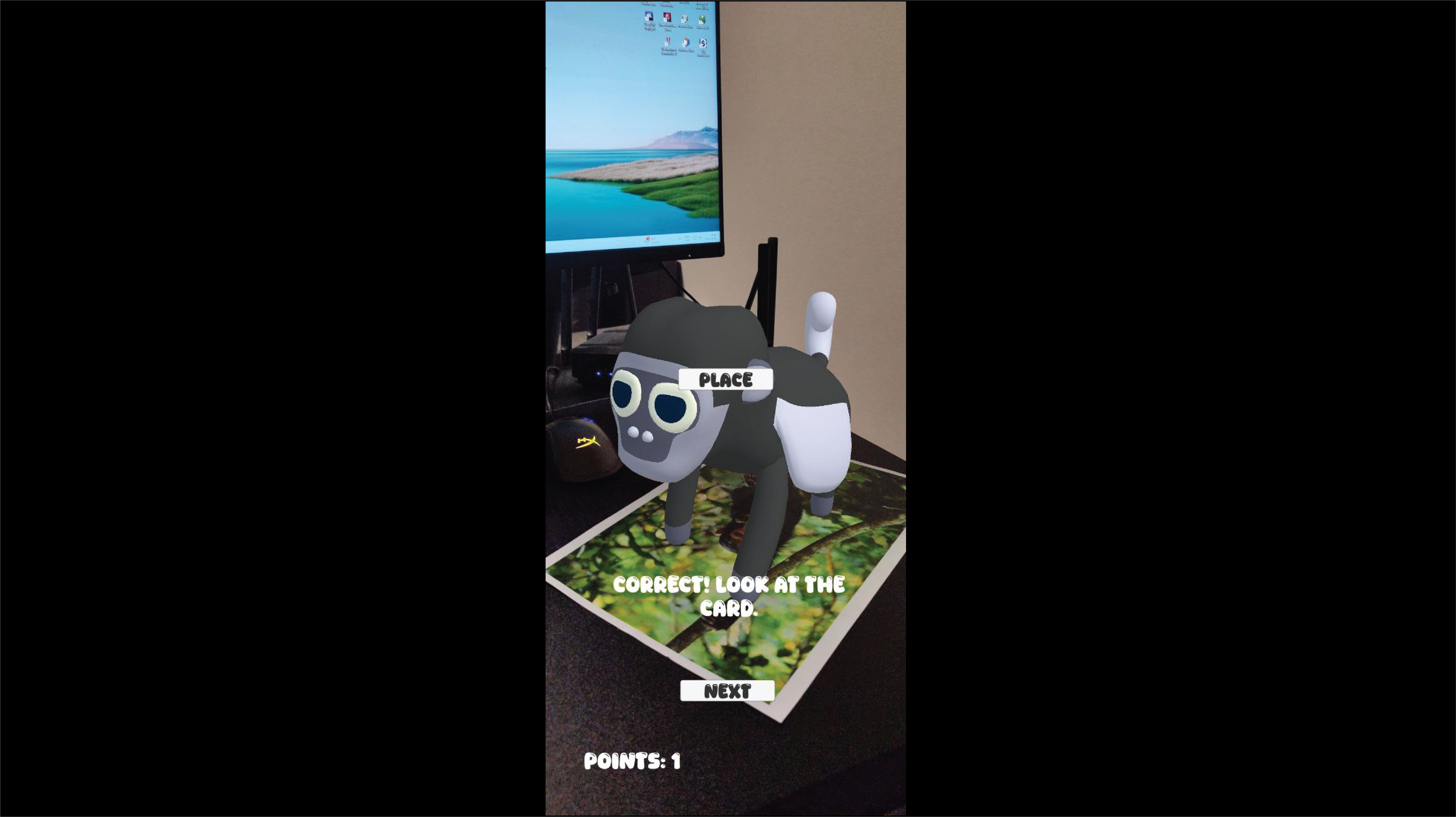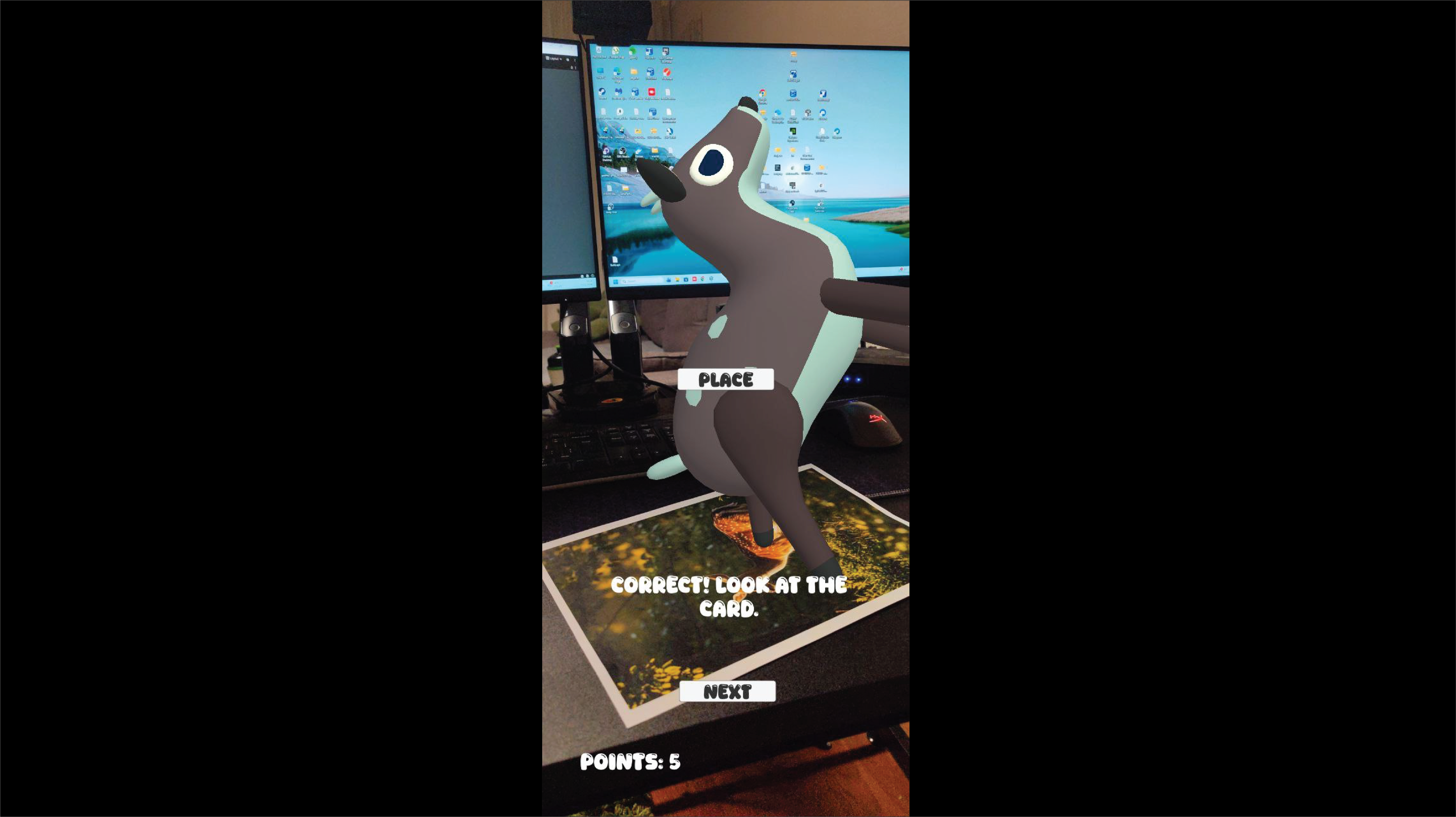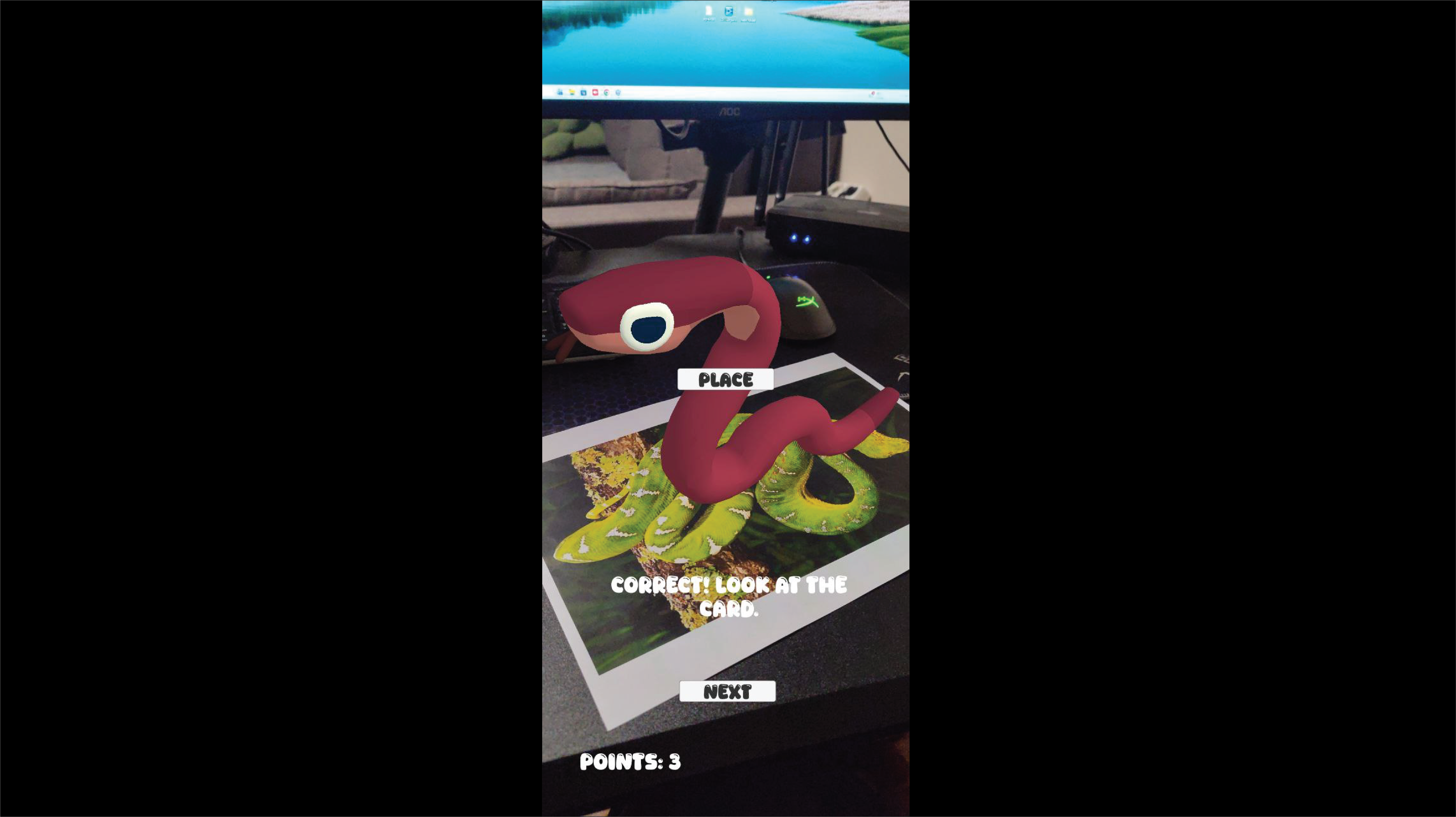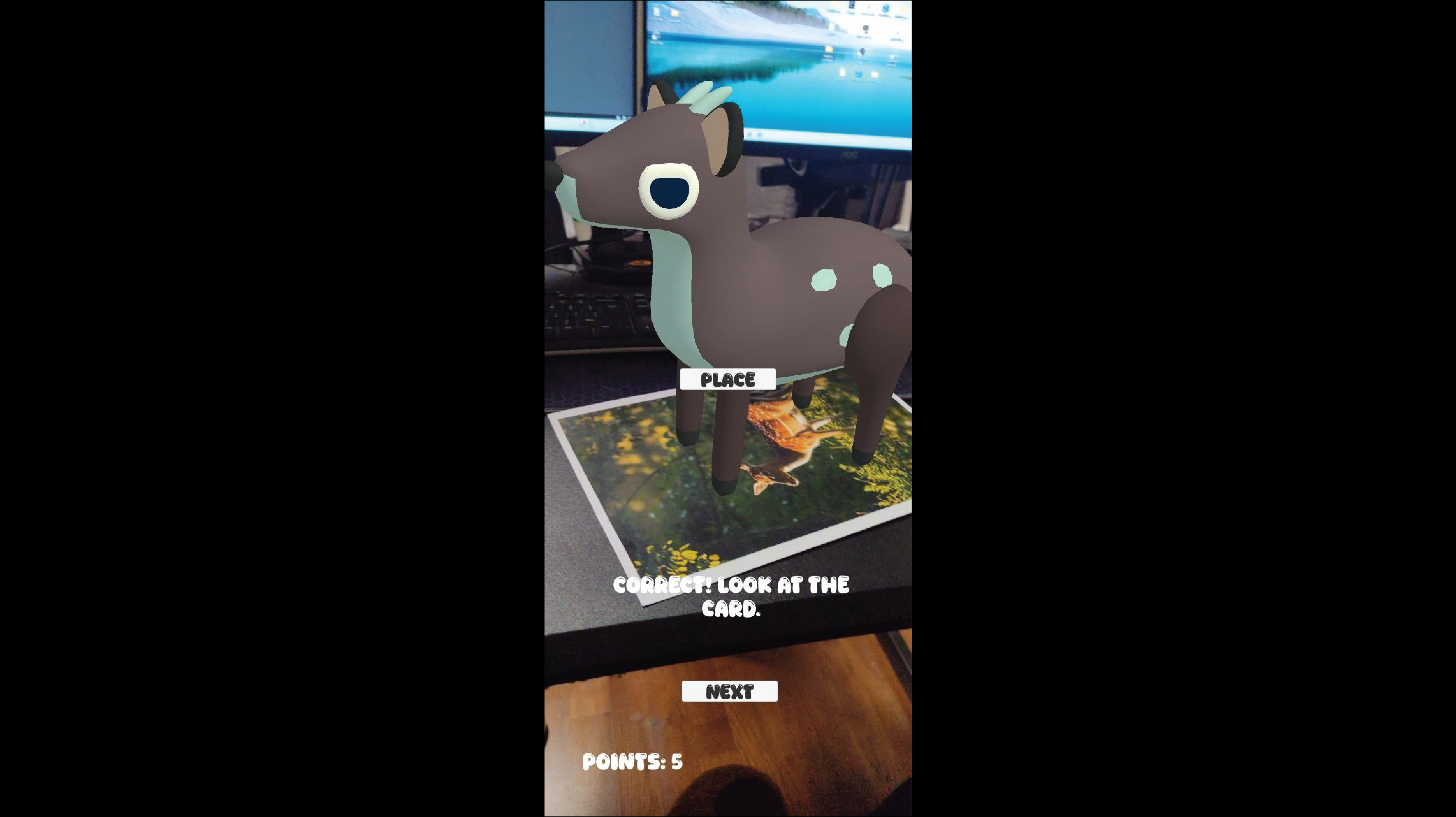 Using the camera, you point it at a card with an animal and see the question “Who is this?” along with an input field. If you enter an incorrect answer, you can try again. If you enter the correct answer, a 3D model of the animal appears on the card, to which a pleasant animation can be applied, and afterward it can also be placed on a table. Additionally, when the answer is correct, the guessed word is pronounced aloud in the application.