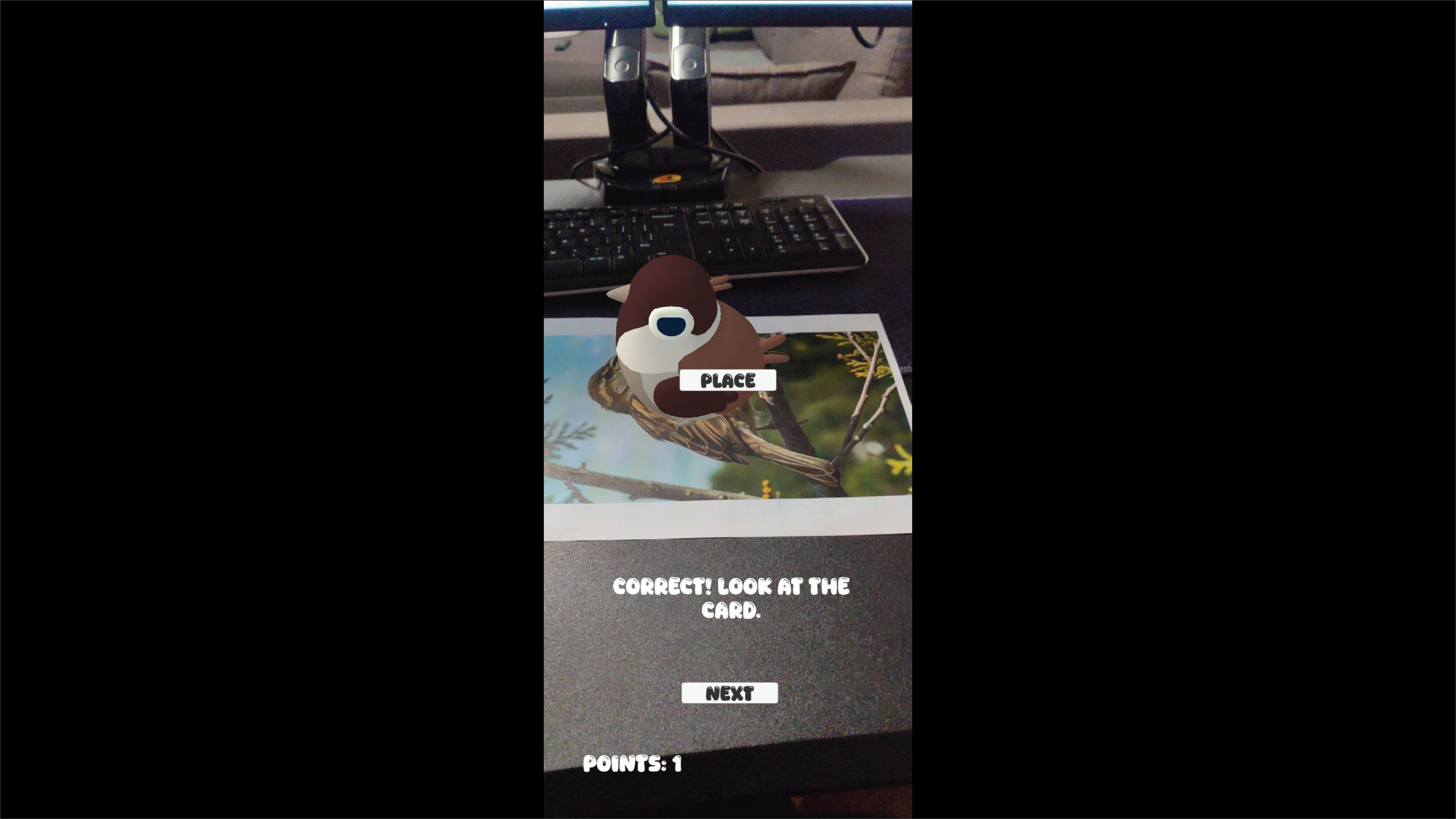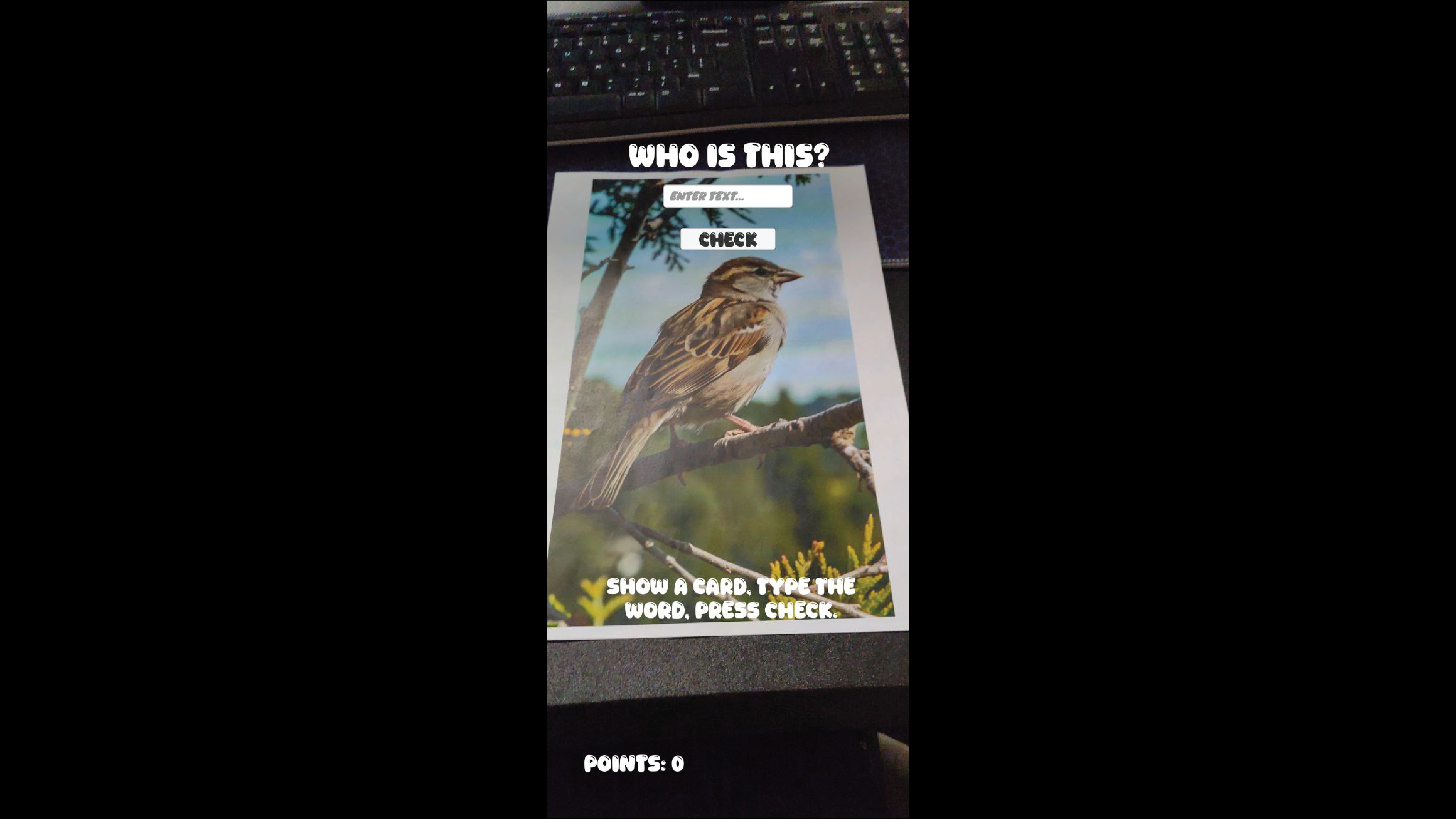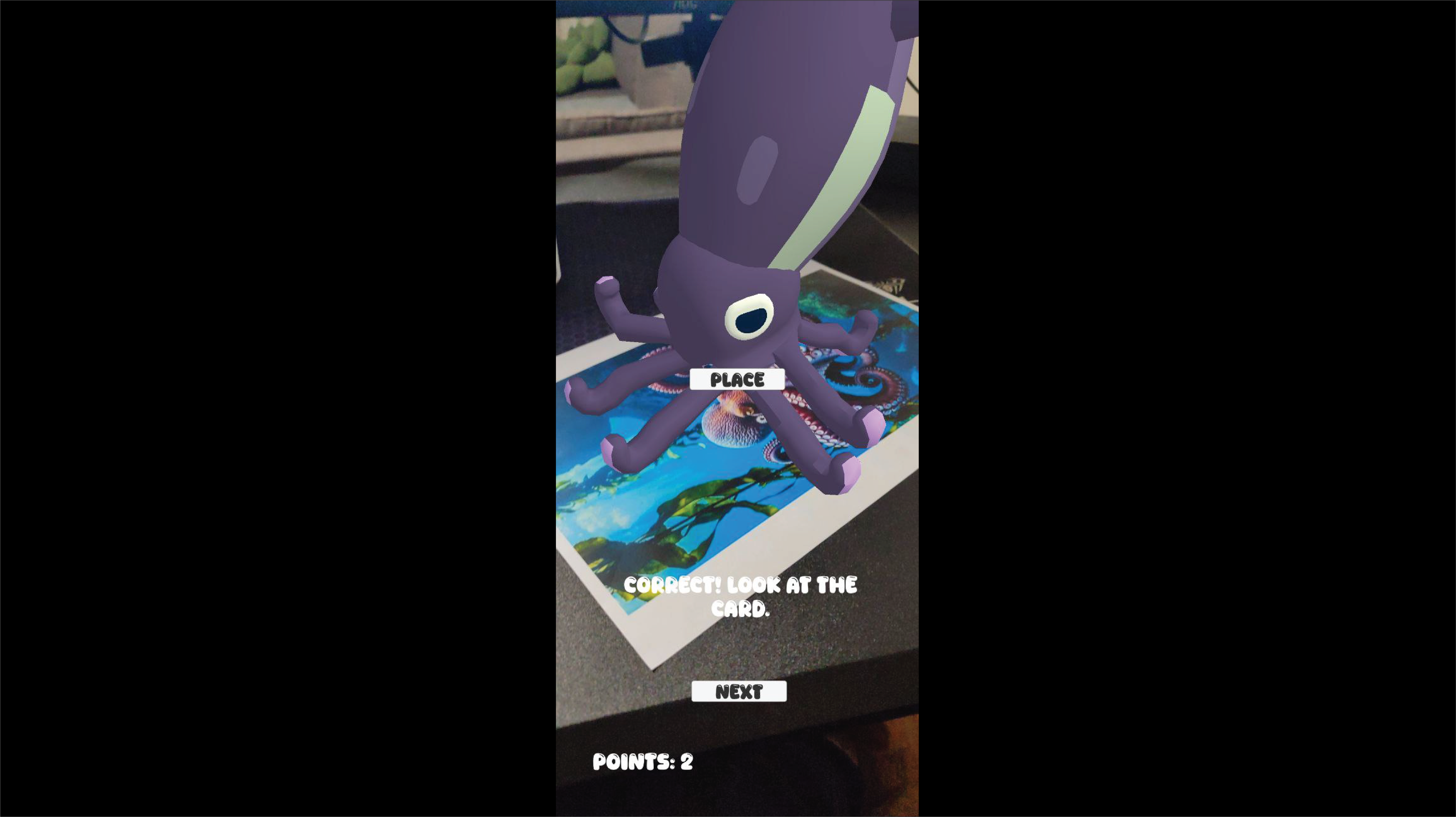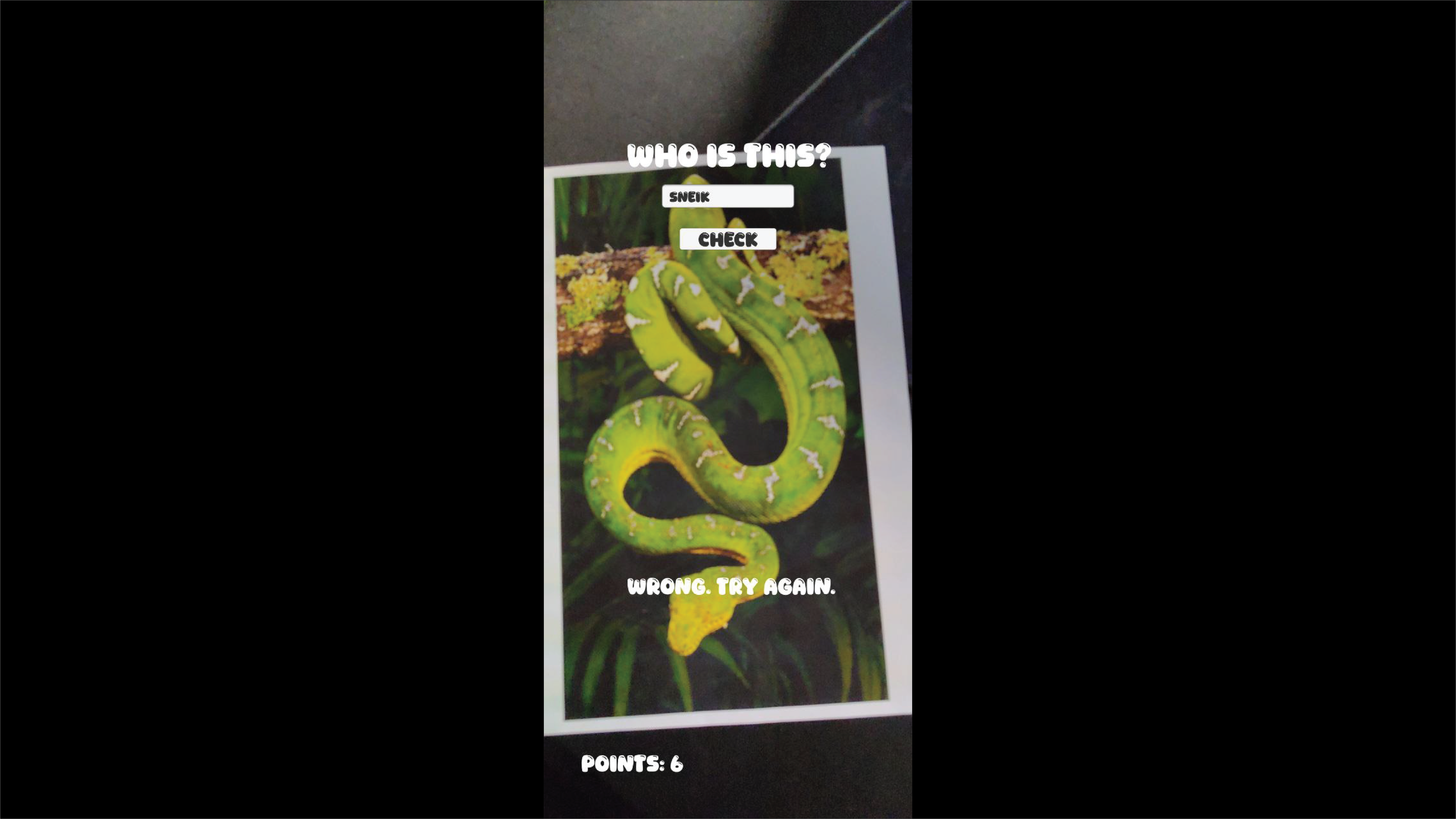 Using the camera, you point it at a card with an animal and see the question “Who is this?” along with an input field. If you enter an incorrect answer, you can try again. If you enter the correct answer, a 3D model of the animal appears on the card, to which a pleasant animation can be applied, and afterward it can also be placed on a table. Additionally, when the answer is correct, the guessed word is pronounced aloud in the application.