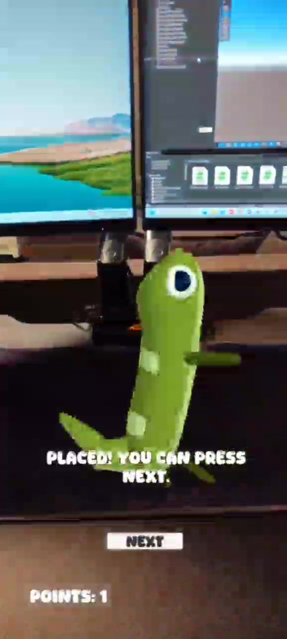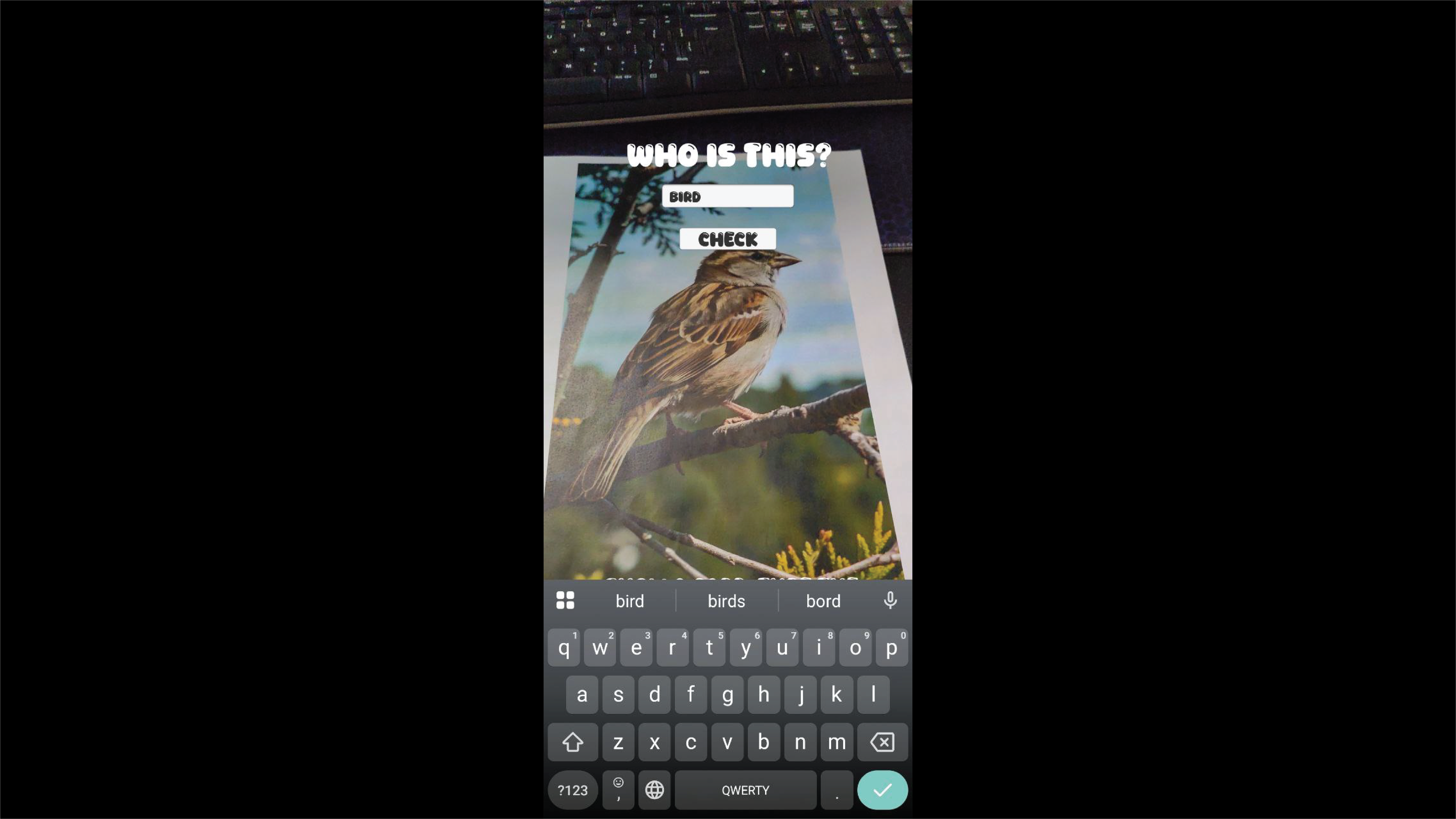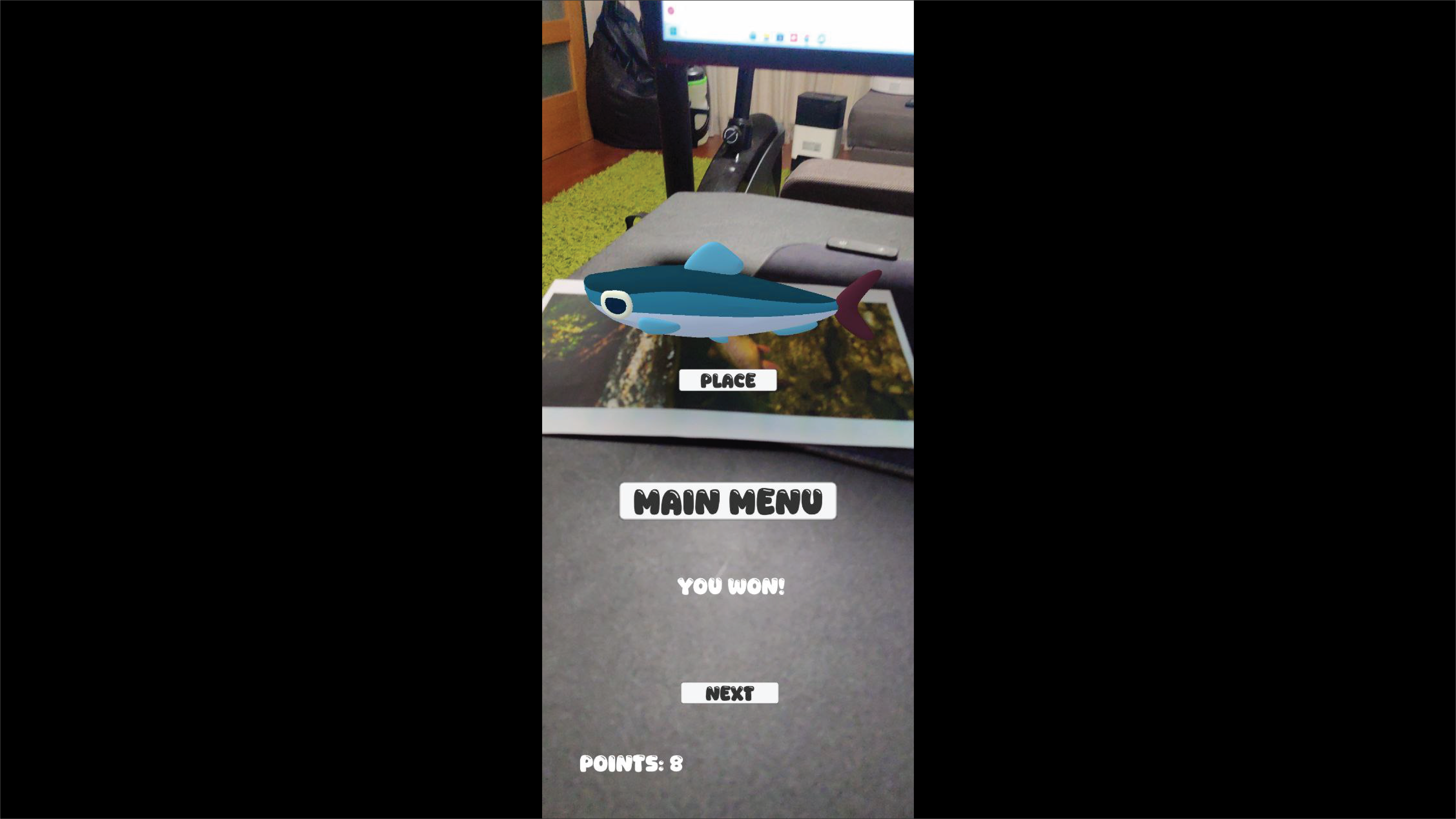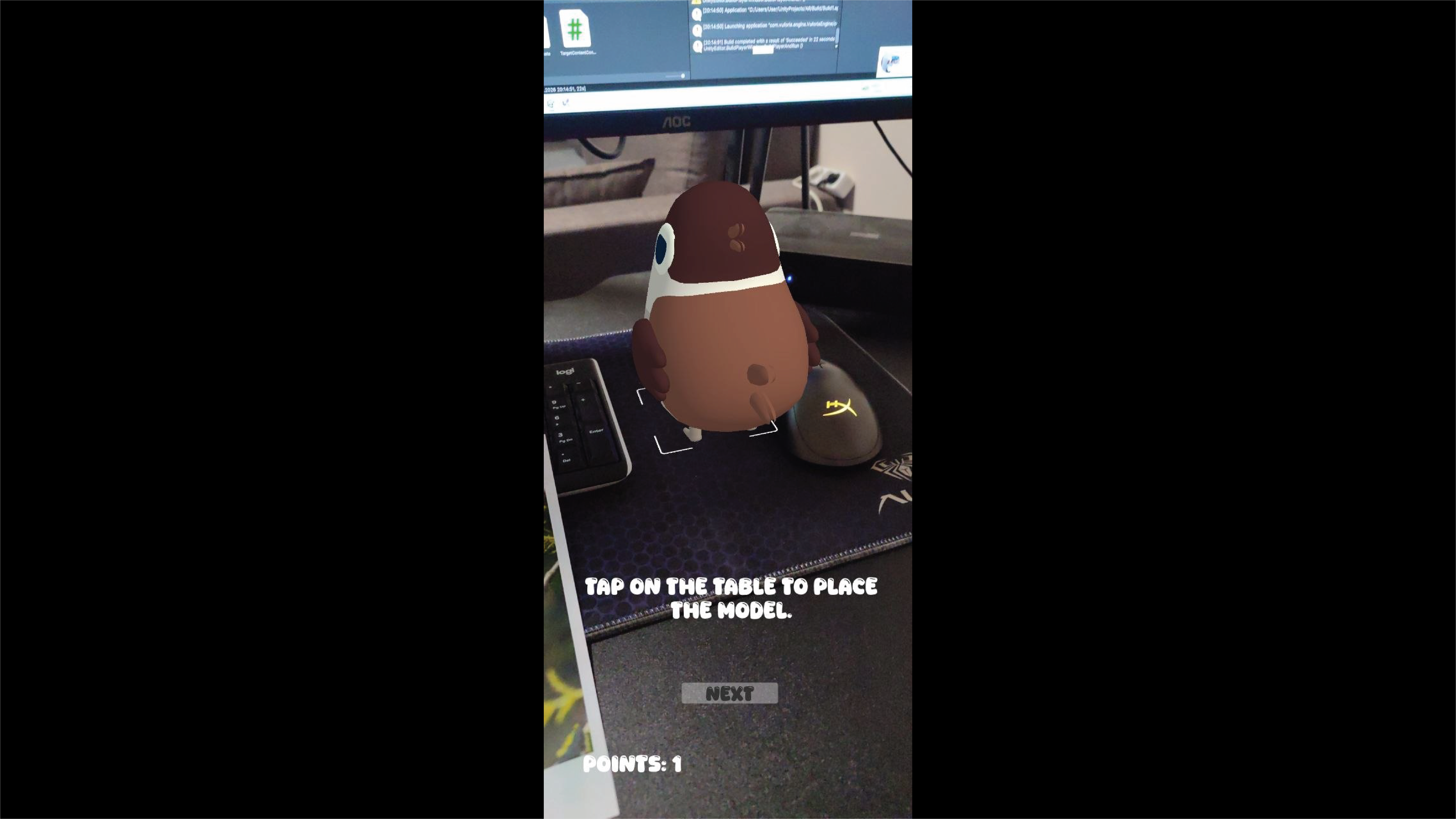 Using the camera, you point it at a card with an animal and see the question “Who is this?” along with an input field. If you enter an incorrect answer, you can try again. If you enter the correct answer, a 3D model of the animal appears on the card, to which a pleasant animation can be applied, and afterward it can also be placed on a table. Additionally, when the answer is correct, the guessed word is pronounced aloud in the application.